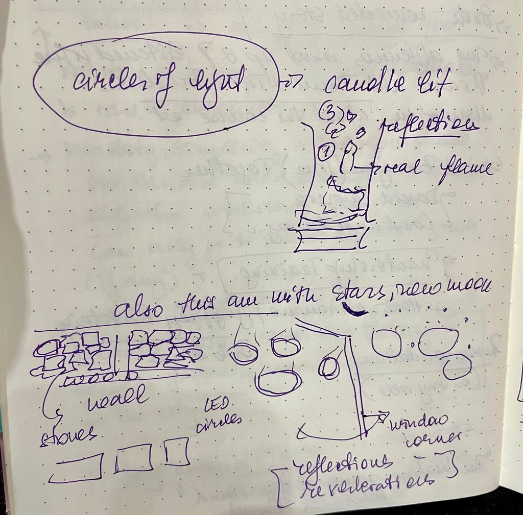 This morning, a beautiful new moon was ever so close to us, surrounded by a trillion of stars. The circles of light were reflecting themselves outside the room and found myself mesmerised both by this multiplications of light and flame reflections on a background of a bold dark bleu sky, giving way to a shy pink sunrise. The sun was not that visible amidst clouds and the moon enjoyed its reign for long in the early morning.