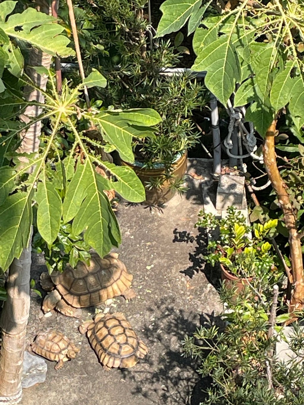 At times just by looking around.I almost knew what a sunny day means here. It means this happy family of tortoises will enjoy their breakfast of green salad outdoors.