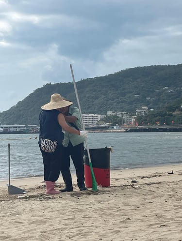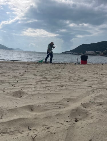 Finding a spot on the beach to take a moment and ground, I only turned my head for few seconds to and when I finally settled and took a deep breath to enjoy the view, this hard-working gentleman showed up just near me and planted his big red garbage collecting bin “next-door” sort to speak. My first reaction was to get a bit frustrated as I was anticipating a great horizon outlook only by myself, considering the very early hours on Sunday morning. Luckily for me, I have dismissed as nonsense my own frustration in about 10 seconds.