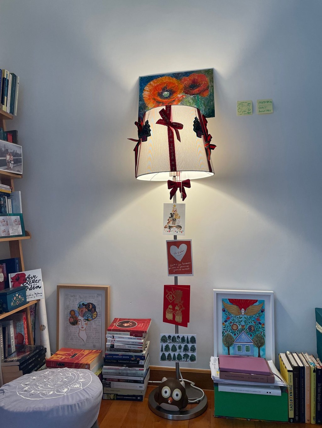 The bookshelves looked overwhelmed for a while and placed on a wrong wall that was quite isolating for my books. I brought it back to my living room, next to a floor lamp where I can see my authors and where I can pick a book for inspiration daily. My floor lamp turned into the ever evolving Christmas tree, always inspired by all the cute crafted trees of internet. A lot of unorganised art books, bigger albums are now simply lined up against the floor. My friends declared it a bohemian artist home and they even said it seems pretty organized to them. So, no further fuss here.