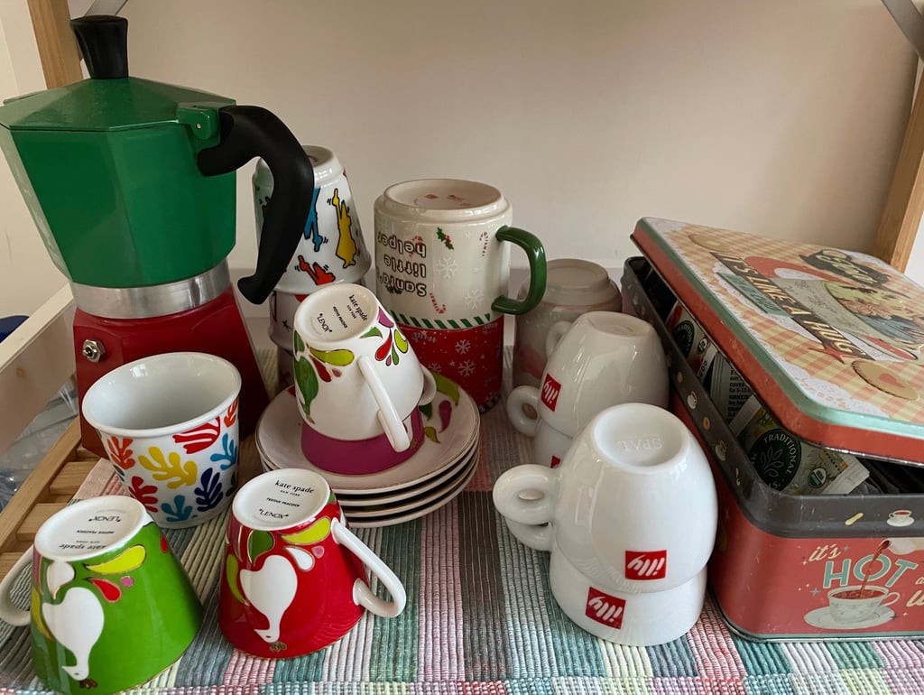 The lack of massive blocks of furniture keeps all objects visible .I came to realize that my coffee cups match quite well my carpet. The theme tends to be pink, white, red, greens and some purple. The bedroom has now a blue/green vibe from the Japanese tatami.Minimal and functional objects with pops of colours and vibrancy. If there is a name for this decorating trend, please message me.